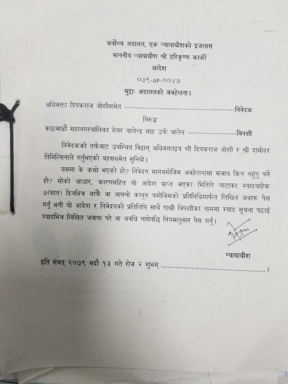 सोमबार न्यायाधीश हरिकृष्ण कार्कीको एकल इजलासले महानगर प्रमुख साहसँग अवहेलनामा सजाय नहुनुपर्ने कारणसहित सात दिनभित्र लिखित जवाफ पेस गर्न आदेश जारी गरेको हो ।